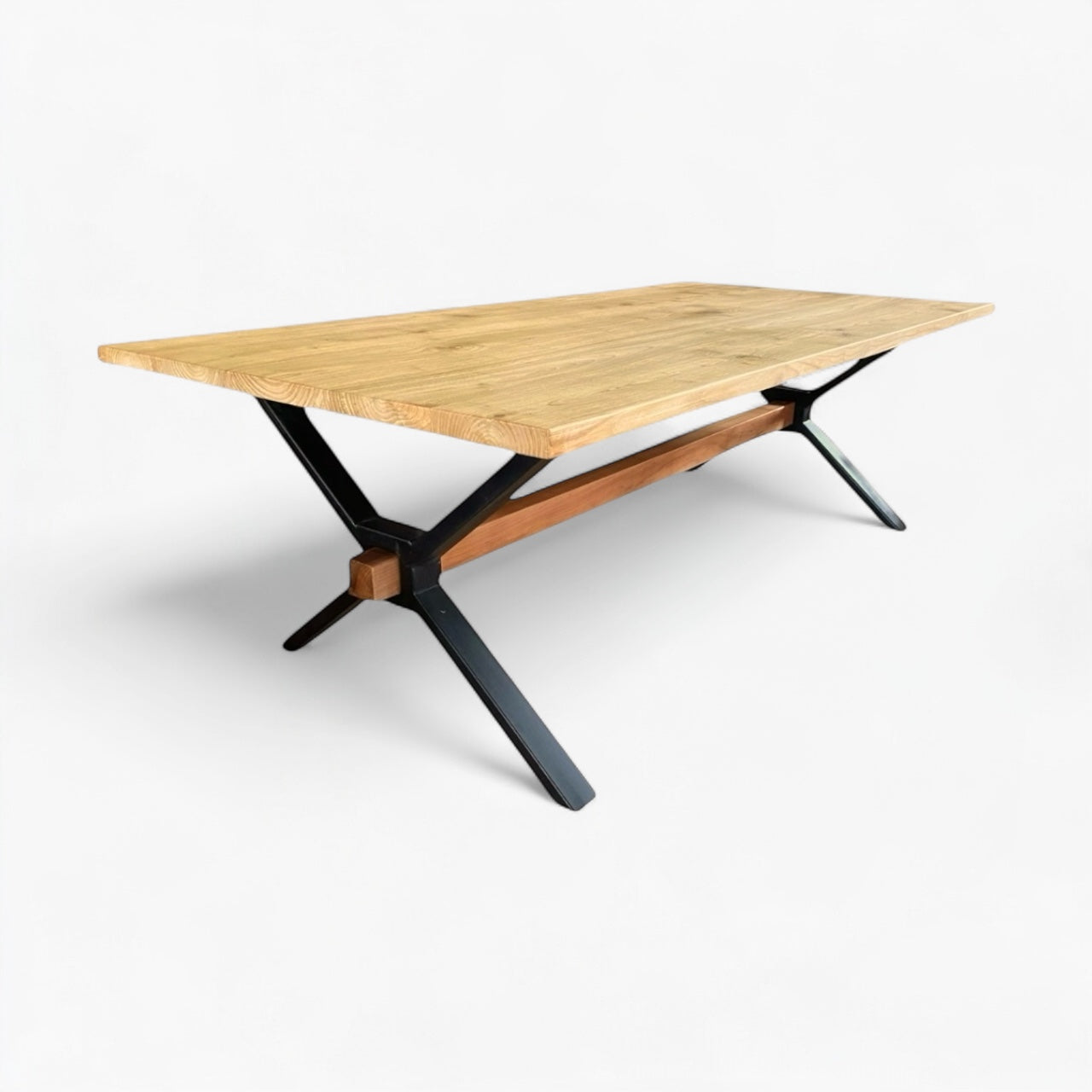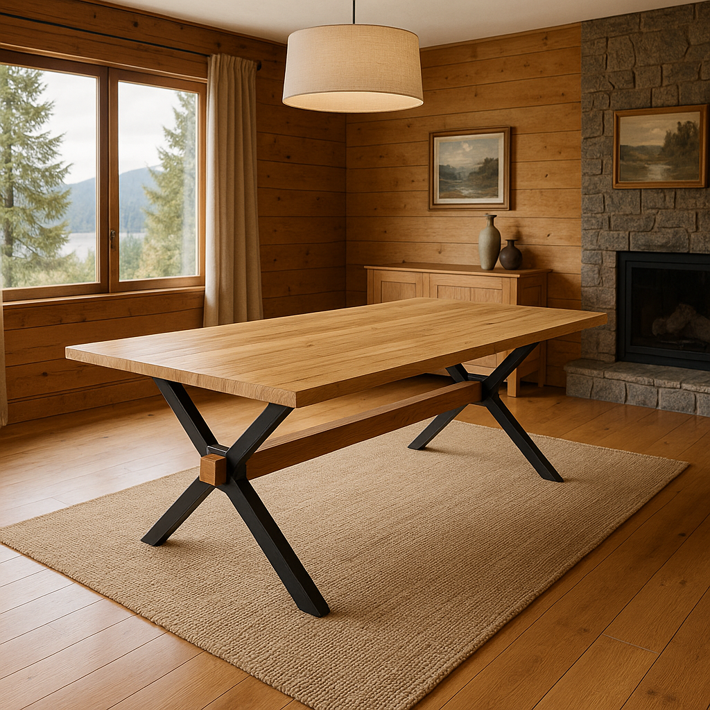 La Mesa Lago Puyehue destaca por su diseño firme y armónico. Su cubierta de madera noble maciza se complementa con una base metálica en forma de cruz y un larguero en madera, convirtiéndola en una pieza con identidad propia, que no solo aporta estabilidad, sino también una estética distintiva y equilibrada.